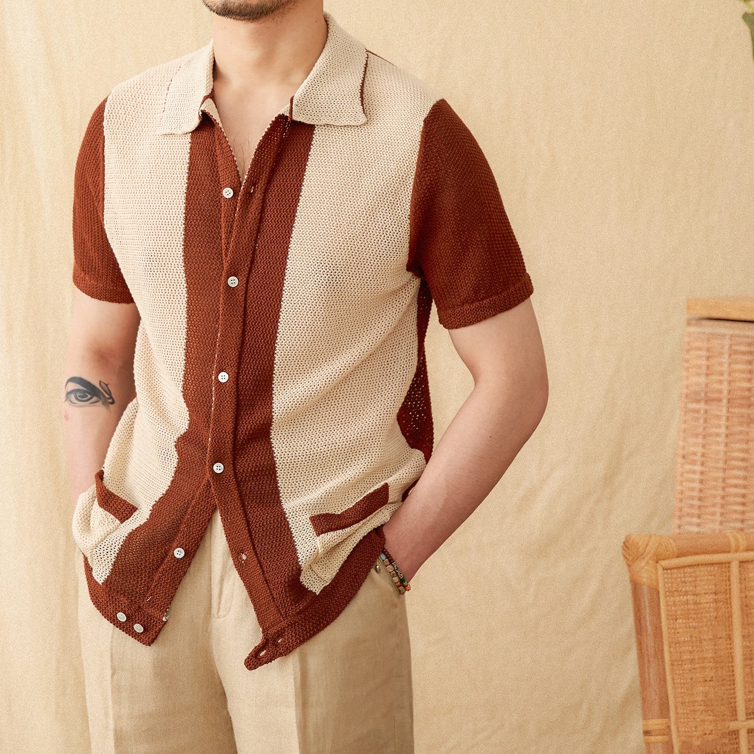 Hollow Cotton And Linen Lapel Short-sleeved Cardigan Knitted Top
