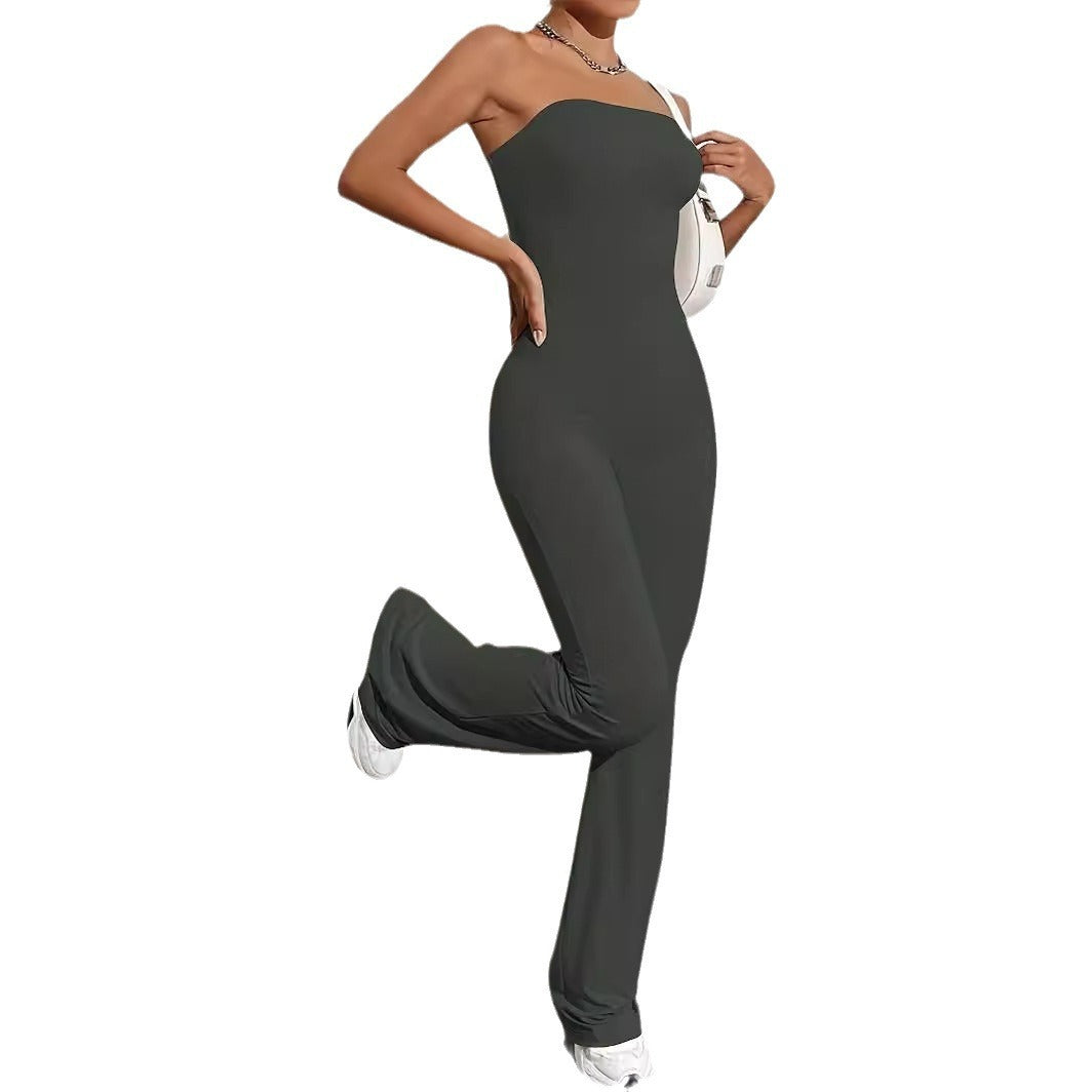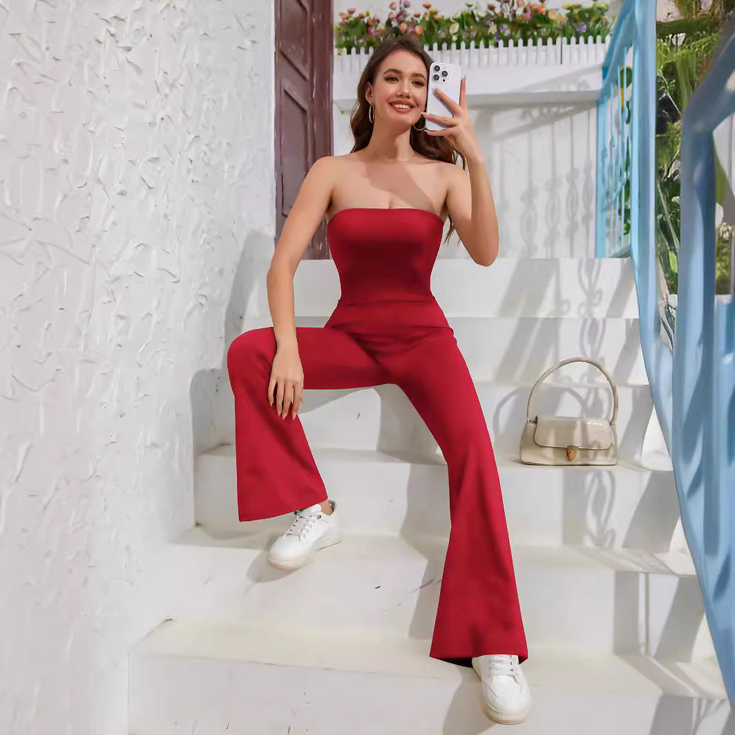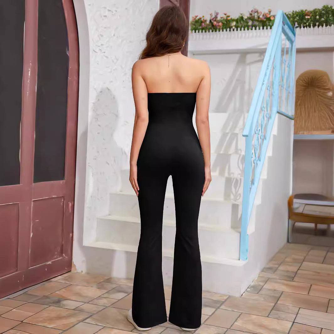Solid Color Strapless Tube Top Flared Fit One-piece Trousers